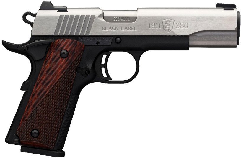 The 1911-380 Black Label Medallion has rosewood grips. Stainless steel finish. Full size, 85% scale 1911 pistol chambered in 380 ACP. Steel bar-dot combat night sights. Composite frame, ergonomic and skeletonized controls. It comes with a composite frame with machined aluminum subframe, blackened stainless steel finish with silver polished flats. The grips are checkered rosewood, steel bar-dot combat night sights that are dovetailed into the slide. The Browning 1911-380 combines two of John M. Browning’s most lasting innovations – the Model 1911 and the 380 ACP cartridge – into a modern, lightweight pistol. Unlike most of the modern “pocket pistols” that chamber the snappy 380 ACP cartridge, the 1911-380 is slightly larger to better manage recoil for improved control that makes follow-up shots faster and more accurate. The grip is compact, yet is long and wide enough to allow the shooting hand to get all four fingers to wrap around the grip for added shooting comfort and control.