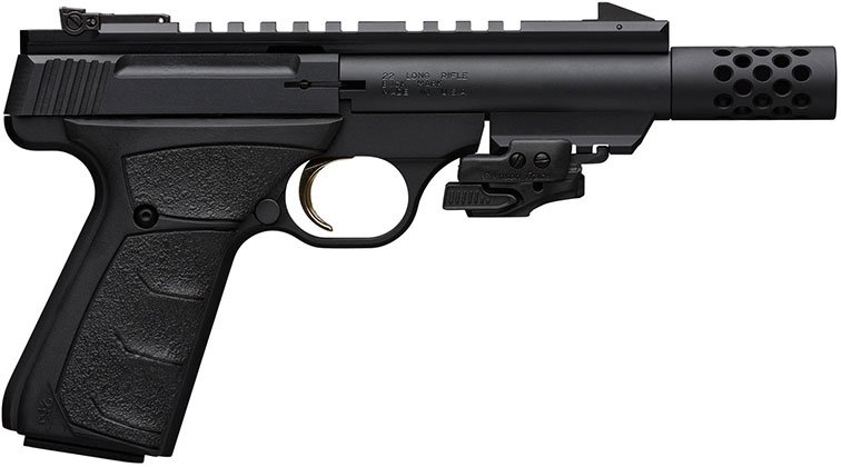 Browning Buck Mark rimfire pistol has lead the industry in quality, reliability, accuracy and variety. It starts with a piece of aircraft-grade 7075 aluminum alloy, and then is CNC machined to exacting tolerances. The crisp single-action trigger, hand reamed chamber, target crowned barrel and finely adjustable target sights mean the Buck Mark comes ready for fun straight from the box. The slide features built-in recess and raised side panels for better grip, and a convenient manual slide release which is easily operated with the shooting or support hand. It also has grooves plus slide cocking “ears” at the rear making racking the slide back even more convenient. The Buck Mark also utilizes a large manual safety and mag release adjacent to the trigger guard. This Black Label model is suppressor ready and features a bull barrel, Picatinny rail, matte black finish, Ultragrip FX grip, and includes a Crimson Trace laser.