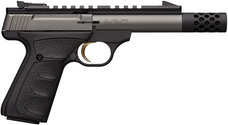 Browning Buck Mark rimfire pistols lead the industry in quality, reliability, accuracy and variety. It starts out as a solid piece of aircraft-grade 7075 aluminum alloy, and then is CNC machined to exacting tolerances. The crisp single-action trigger, hand reamed chamber, target crowned barrel and finely adjustable target sights mean the Buck Mark comes ready for fun straight from the box. The slide features built-in recess and raised side panels for better grip. Its convenient manual slide release is easily operated with the shooting or support hand. A 16-click per revolution adjustable Pro-Target sight is standard. This sight provides a finer range of adjustment over the industry’s standard of 12 clicks per revolution. The Buck Mark pistol also features a large, manual thumb safety, mag release adjacent to the trigger guard, and light, crisp trigger. This Field/Target Micro model is suppressor ready, has a bull barrel, muzzle brake, UFX grip, and adjustable sights.