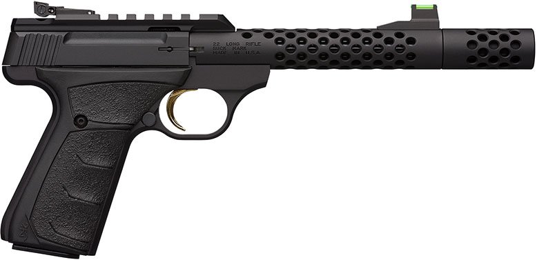 Browning Buck Mark rimfire pistols lead the industry in quality, reliability, accuracy and variety. It starts out as a solid piece of aircraft-grade 7075 aluminum alloy, and then is CNC machined to exacting tolerances. The crisp single-action trigger, hand reamed chamber, target crowned barrel and finely adjustable target sights mean the Buck Mark comes ready for fun straight from the box. The slide features built-in recess and raised side panels for better grip. Its convenient manual slide release is easily operated with the shooting or support hand. A 16-click per revolution adjustable Pro-Target sight is standard. This sight provides a finer range of adjustment over the industry’s standard of 12 clicks per revolution. The Buck Mark pistol also features a large, manual thumb safety, mag release adjacent to the trigger guard, and light, crisp trigger. This Plus model features a Vision barrel which has a tensioned outer aluminum sleeve surrounding a strong steel inner barrel and a black finish on the inner barrel. It also has a muzzle brake, UFX grip, and is suppressor ready. Included are one magazine and a pistol rug.