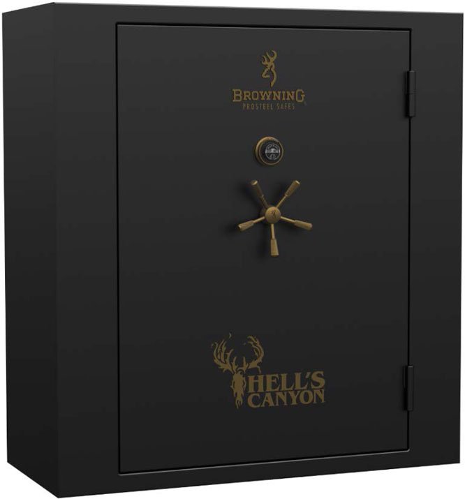 This limited time Hell’s Canyon PRO model features a Satin Black finish with a Burnt Bronze Cerakote finish on a premium five-spoke knurled handle, and lock. It also comes stock with interior lighting and faux leather interior.