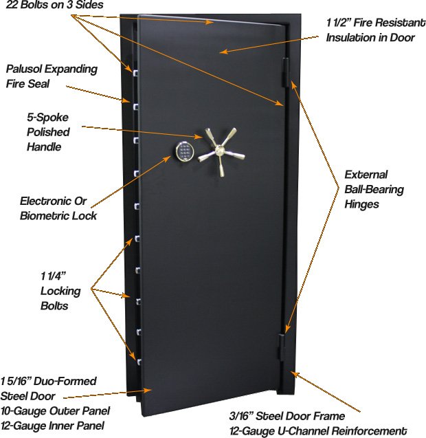 - 3/16″ Steel door frame with 12-gauge reinforced U-channel behind frame