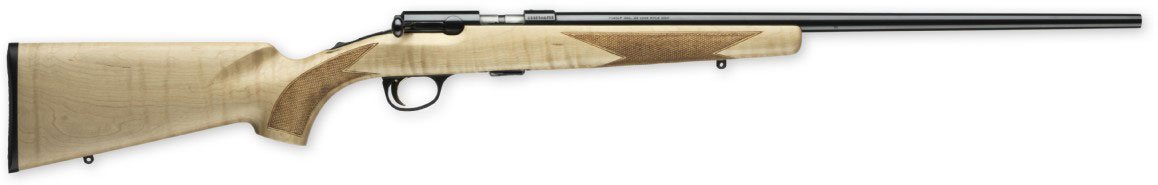 Browning 17 HMR T-Bolt Sporter Maple w/22″ Blue Barrel. Browning T-Bolt, one of the most accurate, handy and easy to shoot rimfires ever produced. Those days can now be relived with today’s T-Bolt, a rifle every bit the equal of the original, with several exciting new features that put this unique rifle in a class by itself. These modern versions rely on the classic straight pull bolt action design to chamber each cartridge fed from a 10 round rotary box Double Helix magazine. The T-Bolts three lever trigger offers a light, crisp break, and every barrel is free floating. This version is offered with a checkered Grade II/III Maple Stock with gloss finish.