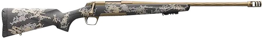 Big game bolt-action hunting rifle with carbon fiber stock with accent graphics, Cerakote Burnt Bronze finish on a stainless steel barrel and action, spiral fluted bolt, spiral fluted and lapped sporter barrel, threaded muzzle, Recoil Hawg muzzle brake and thread protector included.