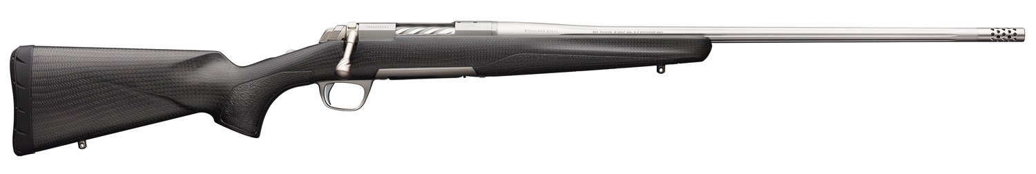 The X-Bolt builds on past Browning rifles, and adds numerous improvements that place the X-Bolt at the top. The X-Bolt’s new three-lever Feather Trigger provides a clean, crisp pull with no take-up or creep and minimal overtravel. The X-Bolt is free-floated by bedding the front and rear of the action for stability and to help maintain barrel to stock spacing for consistent accuracy. A recessed muzzle crown helps protect the rifling from damage. The Inflex 1 recoil pad has proprietary construction and material to promote a directional deflection of recoil forces, pulling the stock comb away from your face to reduce felt recoil and muzzle climb. The bolt unlock button works in conjunction with the top-tang safety to provide an added measure of safety during checking and unloading of the chamber. The X-Bolt Pro Stainless features a matte black 2 Gen Carbon fiber stock offering superior stiffness and durability, satin silver stainless barreled action for high corrosion resistance, ergonomic bolt handle, spiral fluted bolt handle and a fluted barrel. Includes a muzzle brake and thread protector.