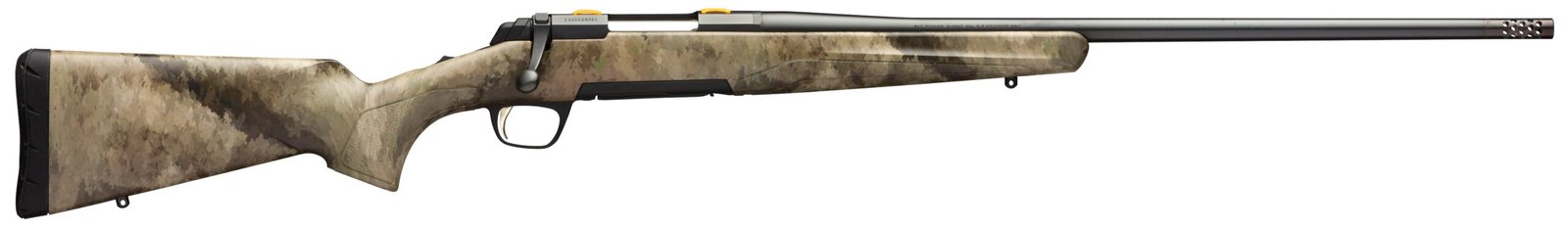 The X-Bolt builds on the proven successes of past Browning rifles, and adds numerous improvements that places the X-Bolt at the top of any side by side comparison. Most notable are the adjustable three-lever Feather Trigger system that offers the best feel on any Browning rifle ever and our proprietary barrel manufacturing systems which produce barrels recognized for their custom-class accuracy. It is free-floated by bedding the front and rear of the action for stability and to help maintain barrel to stock spacing for consistent accuracy. A recessed muzzle crown helps protect the rifling from damage. X-Lock scope mounts feature a four screw per base design that replaces the traditional two screw system. The bolt unlock button works in conjunction with the top-tang safety to provide an added measure of safety during checking and unloading of the chamber. A Short 60 degree bolt lift is fast cycling and allows you to work the bolt quickly without the scope getting in the way. The Western Hunter model features steel receiver and barrel, removable muzzle brake, removable magazine, and adjustable comb stock with A-TACS AU camo finish.